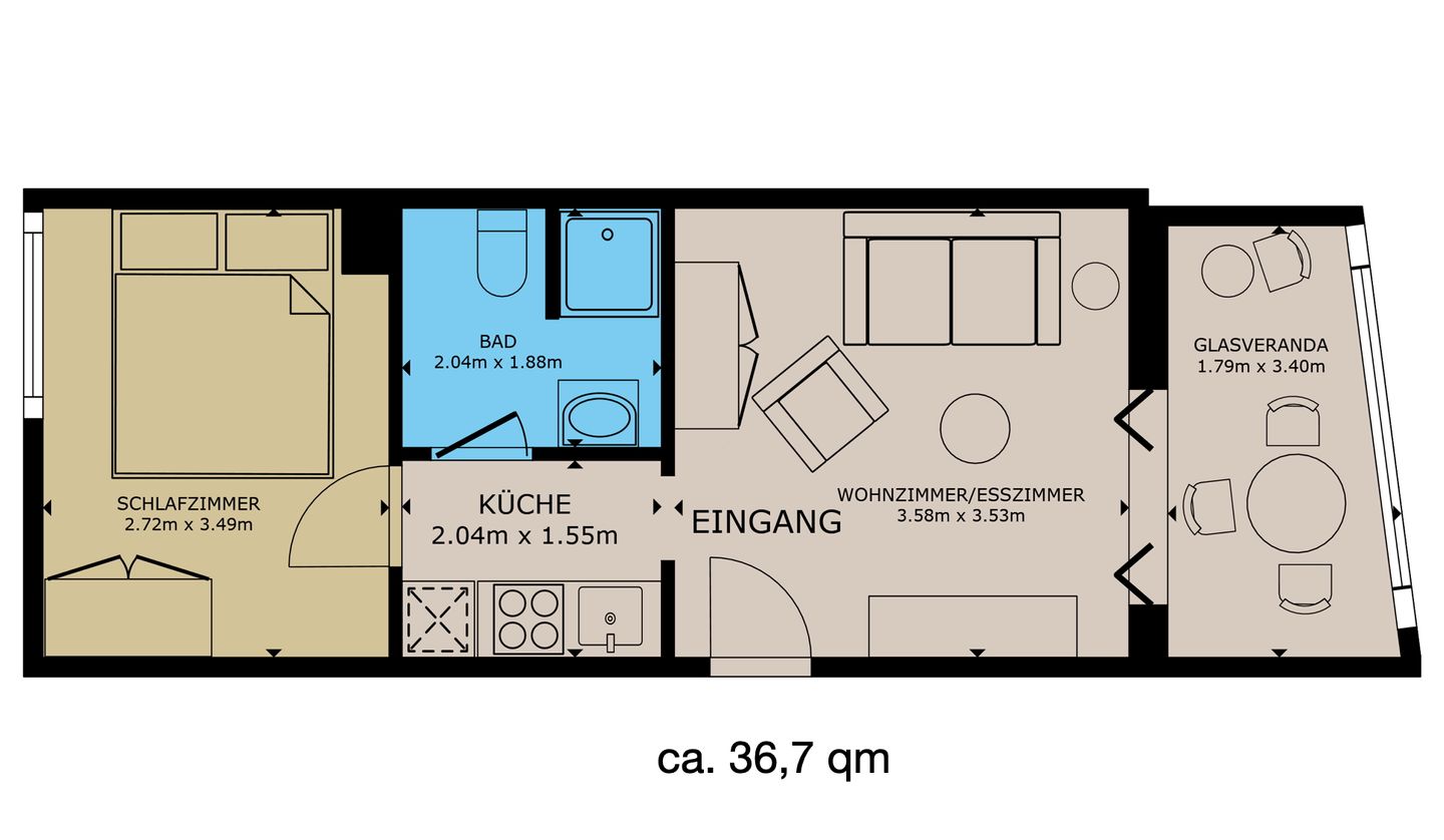 Der Wohnbereich beherbergt eine moderne Küchenzeile mit einer Nespresso-Kapselmaschine. Das separate Schlafzimmer, das abseits der Straße liegt, ist mit einem Doppelbett ausgestattet. Für getrennt schlafende Gäste lässt sich das Ligne-Roset-Sofa im Wohnbereich (als weitere Schlafmöglichkeit) nutzen. Ein Highlight der Wohnung ist die Veranda. Hier darf auch der vierbeinige Freund mitkommen, denn die Ferienwohnung heißt auch Hunde herzlich willkommen. Erlaubt ist maximal 1 Hund (Höhe maximal kniehoch). Die Hundewiese befindet sich in der Nähe des Fährhafens (kein Leinenzwang).