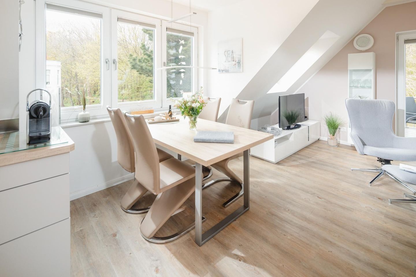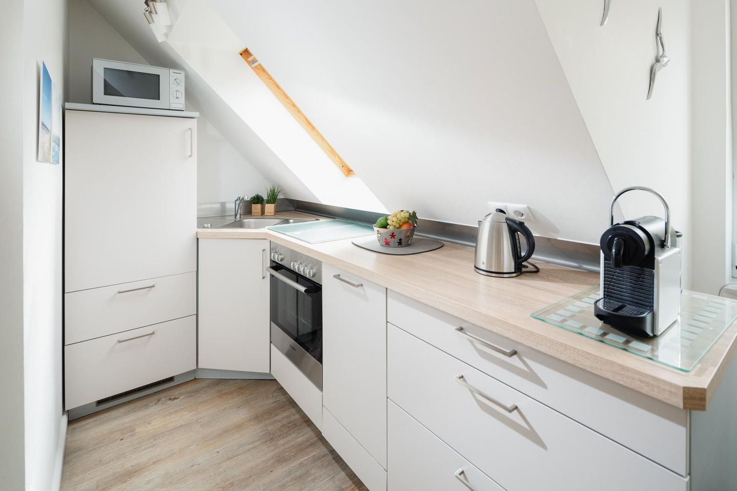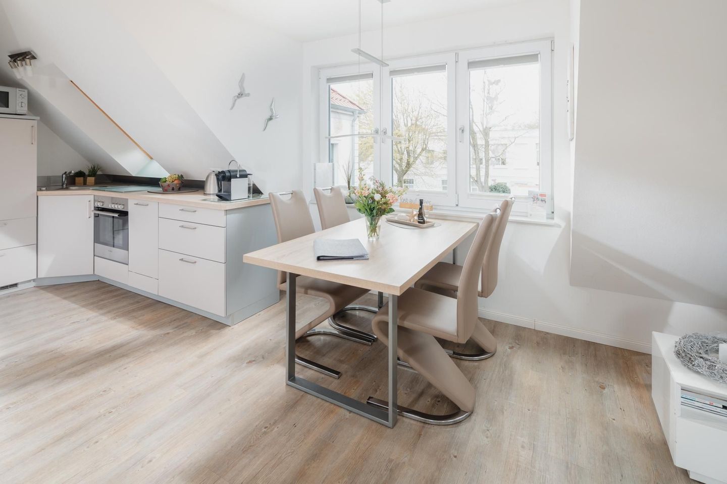 Die Wohnung ist hochwertig und modern eingerichtet, unter anderem mit einer Fußbodenheizung. Die Wohnung verfügt über ein Schlafzimmer mit Doppelbett und ein Wohnzimmer mit einem Schlafsofa, das eine Liegefläche von 140 cm bietet. Eine moderne Küchenzeile und ein Bad mit Dusche und WC runden die Ausstattung ab. Im Badezimmer befindet sich auch eine Waschmaschine, was gerade bei längeren Aufenthalten praktisch ist. Zusätzlich gibt es noch einen zweiten Fernseher im Schlafzimmer. Die Küchenzeile ist gut ausgestattet und die Wohnung verfügt über einen Balkon, welcher vom Wohnzimmer aus betreten werden kann. Hunde sind in dieser Wohnung nicht erlaubt.