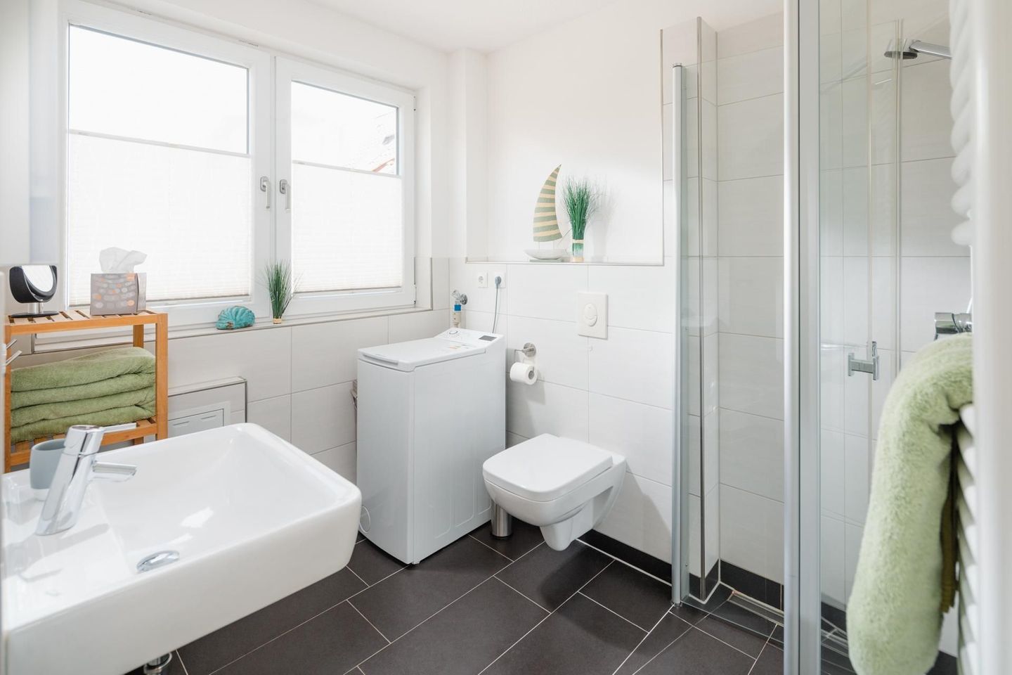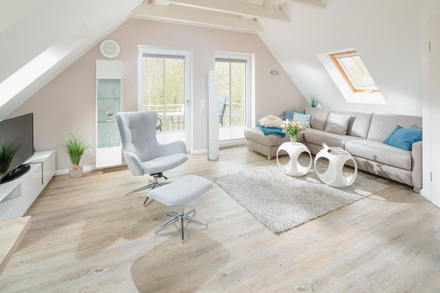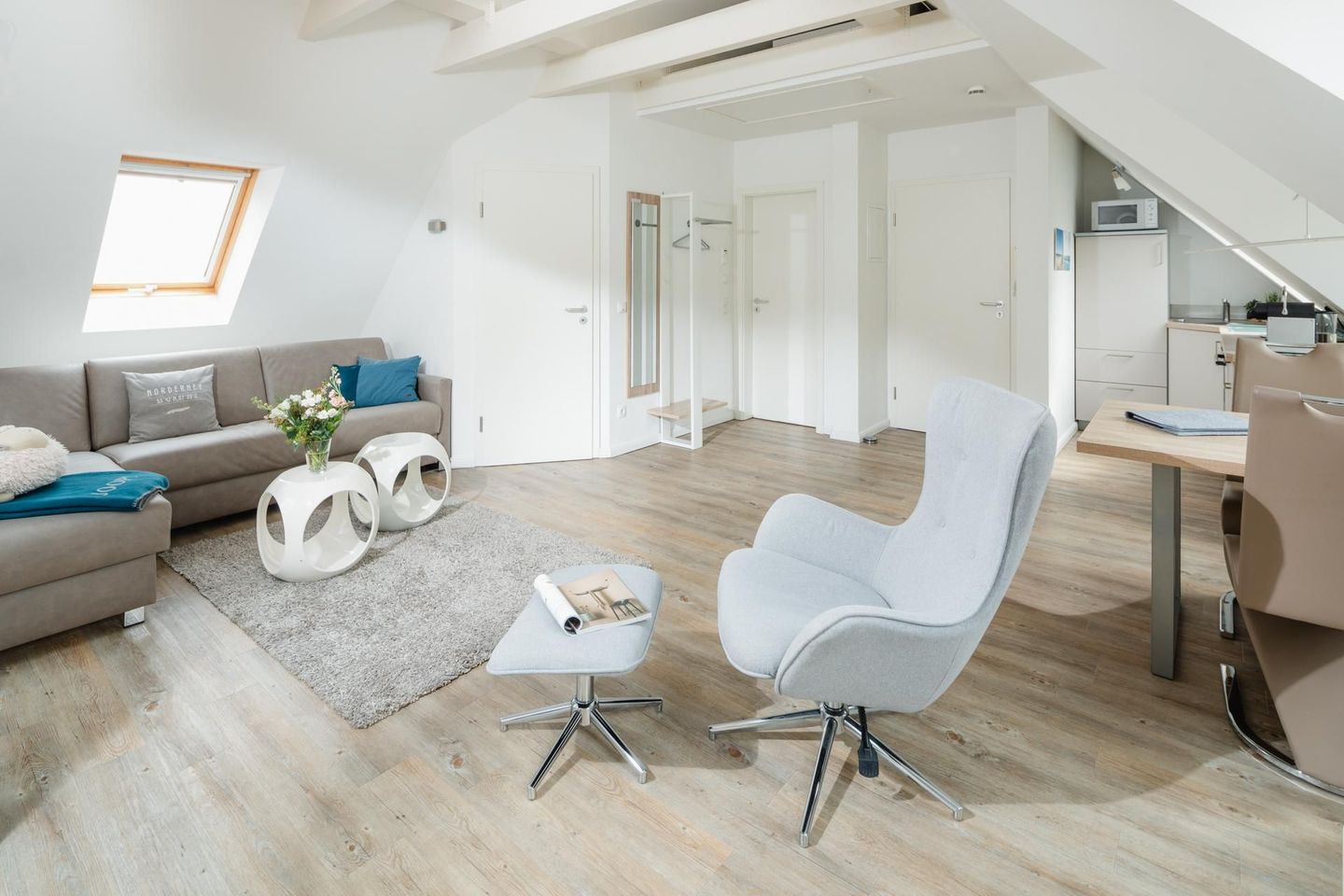 Die Wohnung ist hochwertig und modern eingerichtet, unter anderem mit einer Fußbodenheizung. Die Wohnung verfügt über ein Schlafzimmer mit Doppelbett und ein Wohnzimmer mit einem Schlafsofa, das eine Liegefläche von 140 cm bietet. Eine moderne Küchenzeile und ein Bad mit Dusche und WC runden die Ausstattung ab. Im Badezimmer befindet sich auch eine Waschmaschine, was gerade bei längeren Aufenthalten praktisch ist. Zusätzlich gibt es noch einen zweiten Fernseher im Schlafzimmer. Die Küchenzeile ist gut ausgestattet und die Wohnung verfügt über einen Balkon, welcher vom Wohnzimmer aus betreten werden kann. Hunde sind in dieser Wohnung nicht erlaubt.